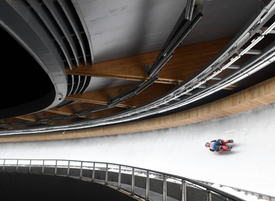 A 1.9 km Olympic bobsleigh and luge track using a hybrid steel–glulam structure, where laminated timber components provide warmth, natural aesthetics, and resilience in harsh winter conditions.